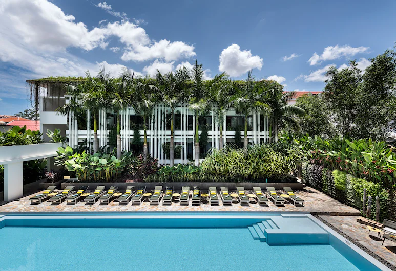 In addition, the hotel is located in a very peaceful environment. The hotel itself is very inspired by the 1950s, with a vintage design but at the same time very modern. What we like a lot, too, in the decor, are the white walls which provide a magnificent contrast with the many colorful and elegant objects that complete the look. There are also several gardens and green areas, in addition to having, of course, a large outdoor swimming pool for swimming or just lounging.
