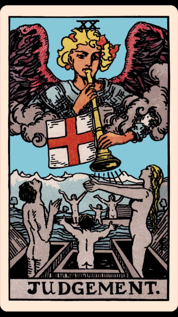 In the Tarot World card, I see a woman surrounded by an oval of the same color as the water of the previous card or of the central character. What I see as a story here is the ability to be at the center of the wheel and to have it spinning around us and no longer to be on the wheel, tossed about by events.